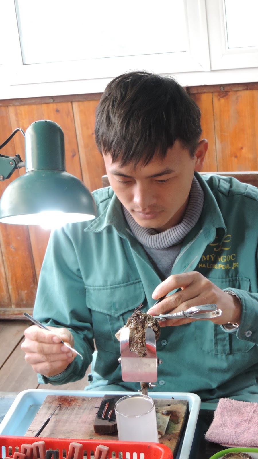 It is quite fascinating, as we watch oysters precisely implanted with a base particle. They are then carefully tended until the pearls should be ready: eighteen months for an Akoya Pearl oyster (white pearls), 3 years for a Lipped Pearl oyster (gold or silver pearls) and 6 years for the Black Pearl oyster. Of the oysters that are implanted, only 50 percent will survive; only 30 percent will make a pearl. Of these, only 10 percent will be jewellery grade.