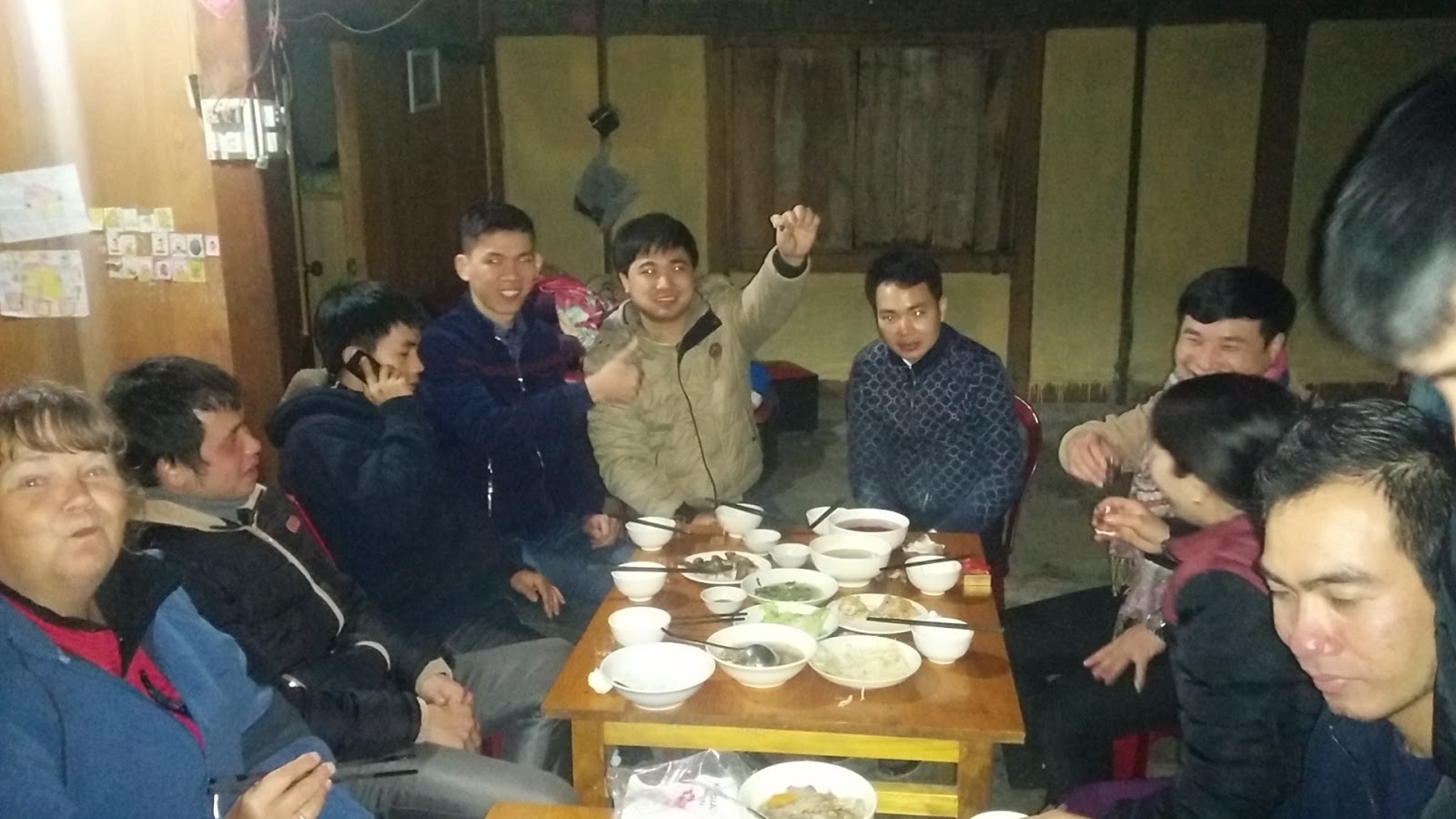 Back on board we clean up and get warm and then enjoy a small Sunset Welcome Party! Fresh fruit, shrimp crisps and Da Lat wine! We learn how to toast each other the Vietnamese way: Mot! Hai! Ba! -- Zao! (One! Two! Three! -- Go!). It is loud and enthusiastic, just as it was while drinking Happy Water at the homestay in Sa Pa. This was followed by an excellent and prettily-presented dinner, after which some had massages, some tried jigging for squid and some of us went to bed!