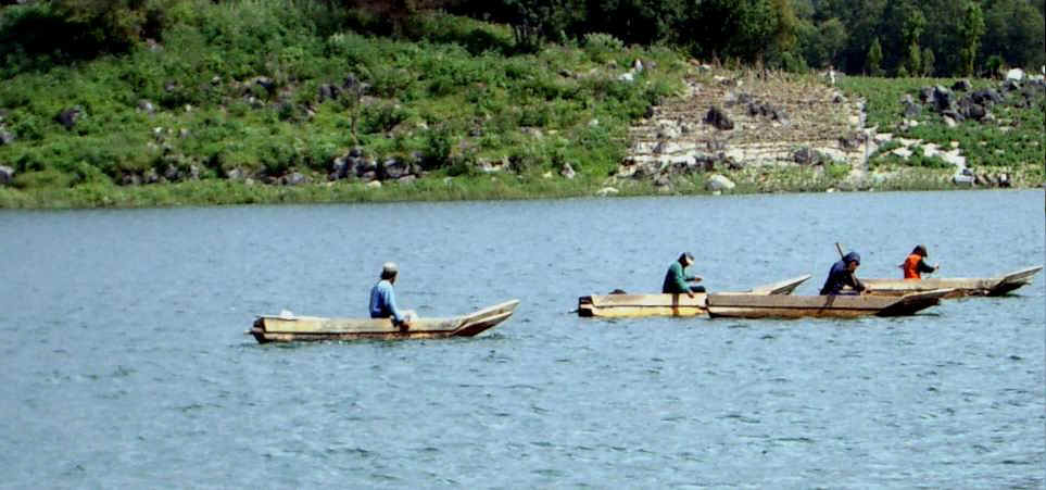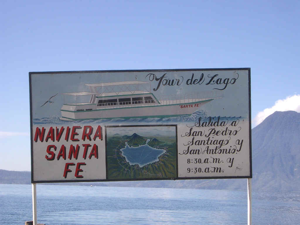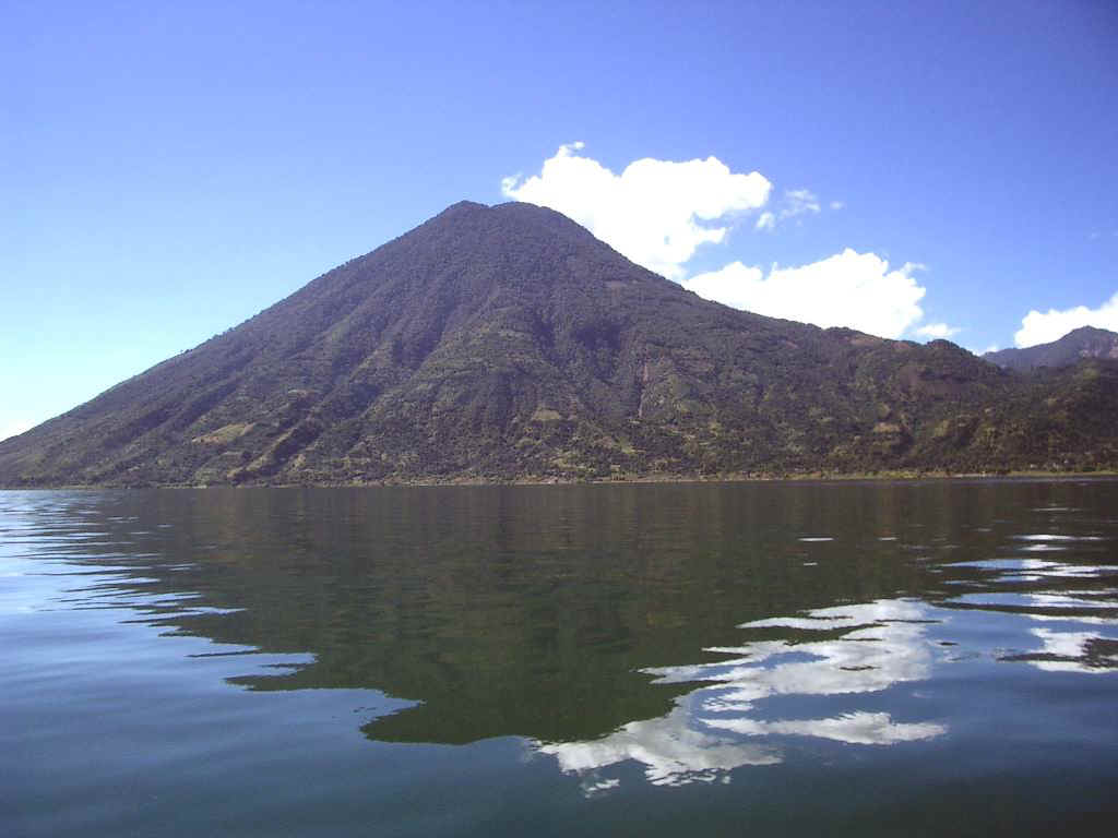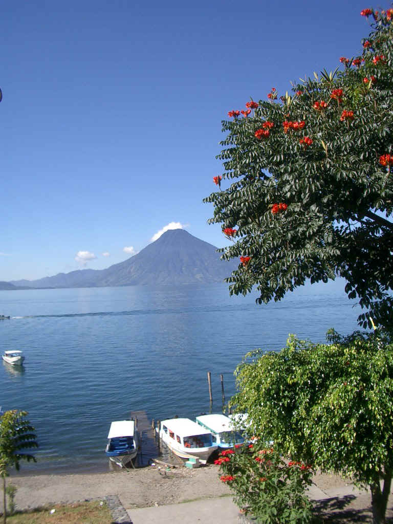 Panajachel is on Lake Atitlan, truly one of Earth's beauty spots. The lake occupies a huge caldera, created by a massive volcanic eruption in prehistoric times. When all the lava had been blown into the atmosphere, a huge cavity was left. The cliffs along the shore fall 900 meters sheer into the lake, the water is 900 meters deep and below the water is some 900 meters of silt and sediment. Around the lake, several "new" volcanoes have arisen, creating stunning landscapes.