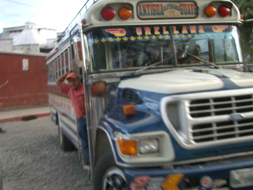 The conductor's job is much more difficult; he has to hang out the door of the moving bus to shout the destination at potential passengers ("GUATE!... GUATE!... GUATE!...), hang out the door of the moving bus to shout and gesticulate at slower vehicles being overtaken, push and squeeze passengers in the door until there is scarcely room to breathe -- never mind to sit down -- and in spare moments help the driver to blow the air horn. The conductor is also responsible for stowing luggage and freight (including occasional livestock; hence, "Chicken Bus") on the roof rack.