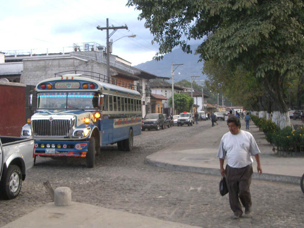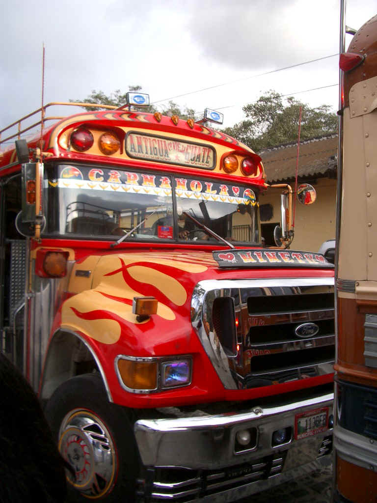 Our visit to Camino Seguro involves our first real introduction to a Guatemalan icon: the Chicken Bus! In Canada and the U.S. a school bus can only be used for five years before it must be replaced. As a result there are hundreds of surplus buses, relatively new and in good shape, available every year. Many of them end up in Guatemala and other Central American countries as privately-operated transit buses. The first thing the operator does is install a very loud air horn. Next, comes a new paint job with brilliant primary colors and lots of aftermarket chrome trim. A luggage rack is installed on the roof and many hand-holds in the interior.