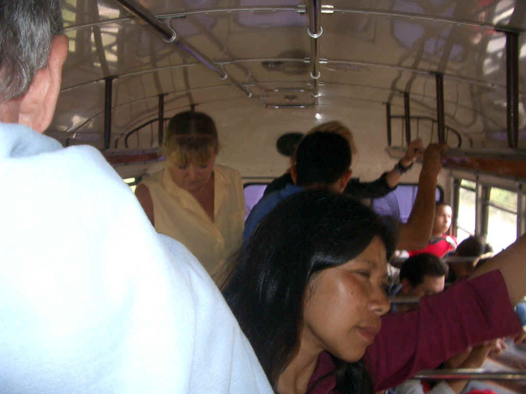 The Chicken Bus business is free-enterprise at its most basic and is very lucrative for the owners. The buses engage in fierce competition for passengers and the drivers and conductors obviously earn a per cent of the revenue. I ask our driver why he drives at such a hair-raising rate of speed and he says if he slows down all the passengers will shout at him to drive faster and, if he doesn't, they will take a different bus. The fares are very cheap; we ride 48 km into Guatemala city, about an hour, for 6.50 Quetzals (about C$1.00) but each bus carries thousands of passengers a day. As we leave Antigua, I remark that the bus is full as there is at least three adults in each seat and the aisle is crowded with standing passengers. Our guide, who rides the bus every day, says: "This bus is NOT full! Trust me!" Another fellow told us about once riding several kilometres with only his feet on the doorstep and grasping the handholds -- unable to even get inside the vehicle. Then, when the bus IS full, the conductor wiggles and squirms his way down the length of the jam-packed aisle, collecting fares. Traveling by Chicken Bus is not for the faint-hearted, but it is never boring!