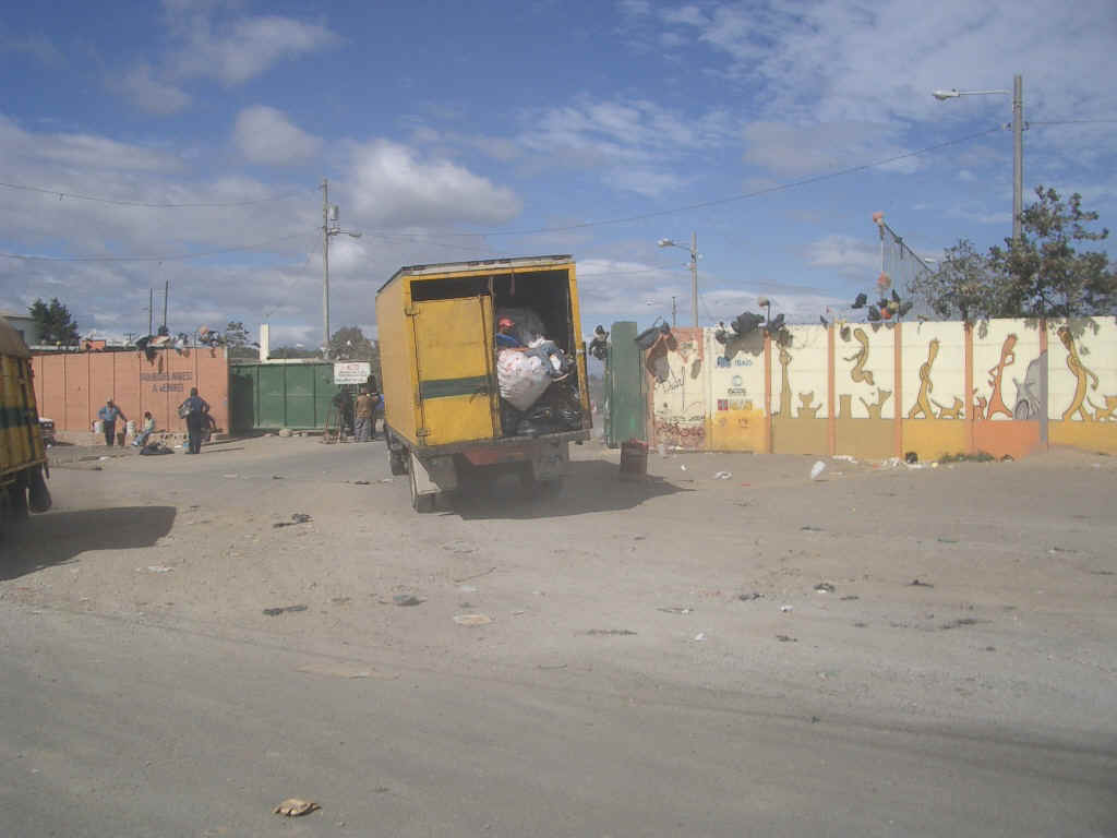 The dump, and therefore the project, is in a desperate part of Guatemala City: houses are built of scavenged pieces of wood, cardboard and corrugated tin. The air is filled with noxious odours, smoke, blowing dust, flying paper and plastic bags. We wait on the edge of the neighbourhood for an escort so we can safely enter. We can't go into the dump, itself, (much to Bob's disappointment) but it surely is one of the hellholes of this world. Everything goes in the dump along with regular garbage: toxic waste, biohazard material, chemicals etc. The garbage pickers spend their days rummaging through this poisonous stew, looking for material they can recycle and sell.