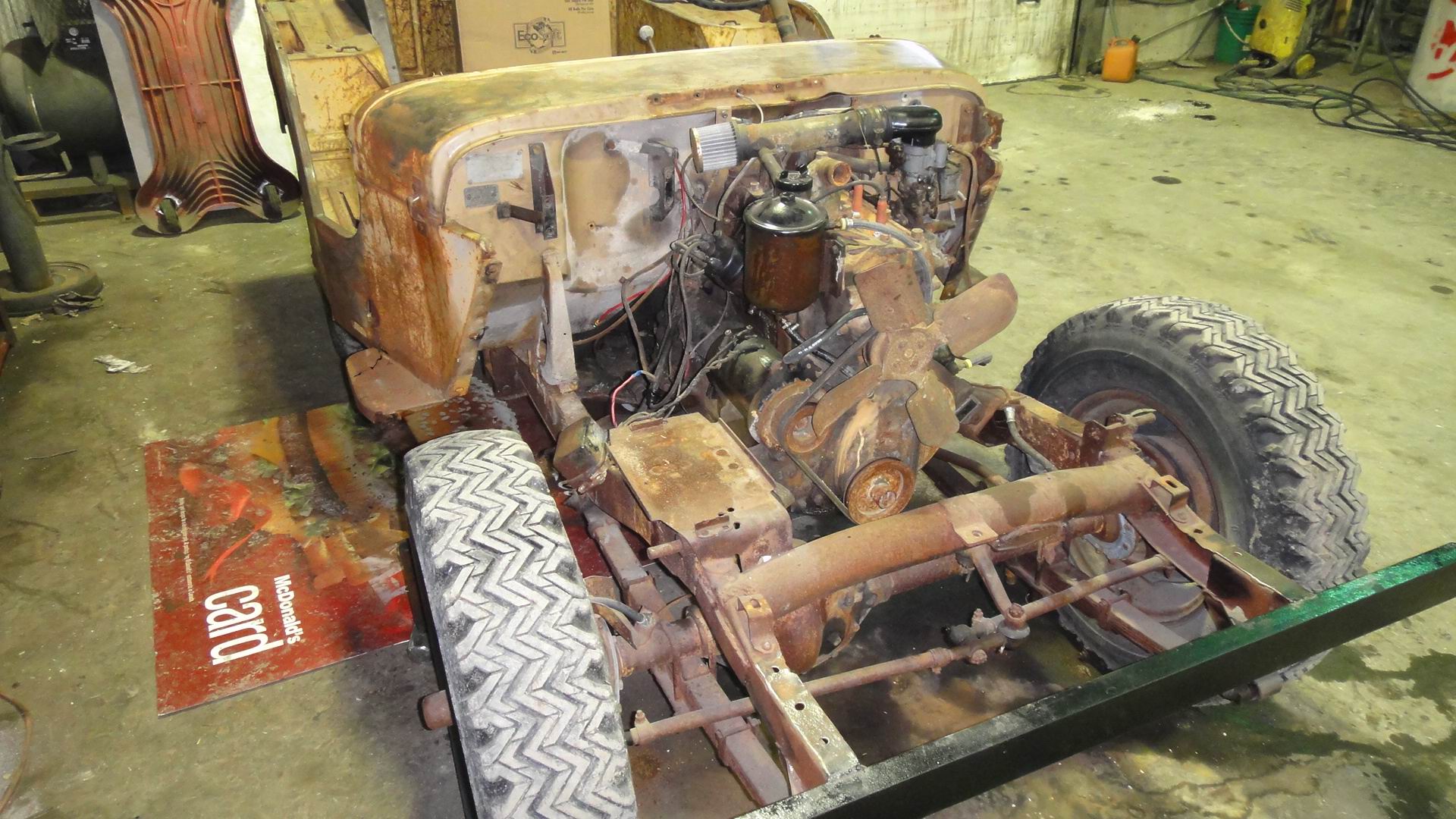 One day in 2009, I spot an old jeep, sitting in the tall grass in a neighbour's back yard. It turns out to be a 1946 Willys CJ2A, the first civilian jeep that Willys built after the war. It looks pretty dilapidated, but on closer inspection appears to be a good candidate for a restoration project. Nearly all the components are there and the owner says it was running when he parked it. It obviously needs lots of work, but best of all, nobody has ever "modified" it, by trying to install a V-8 engine and cutting out the firewall to make it fit, or some such travesty.