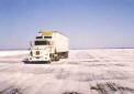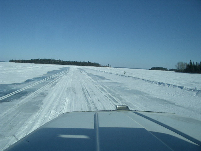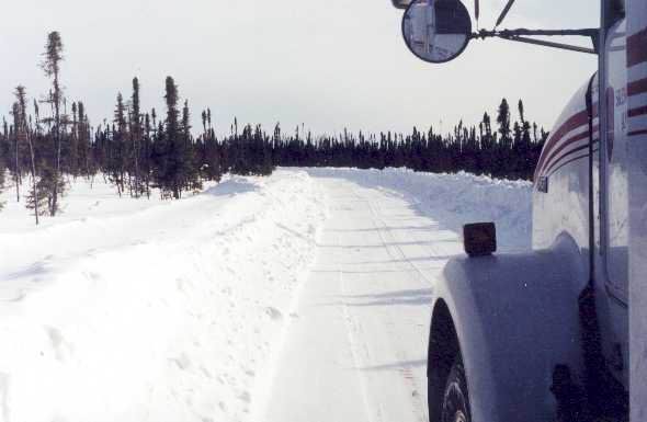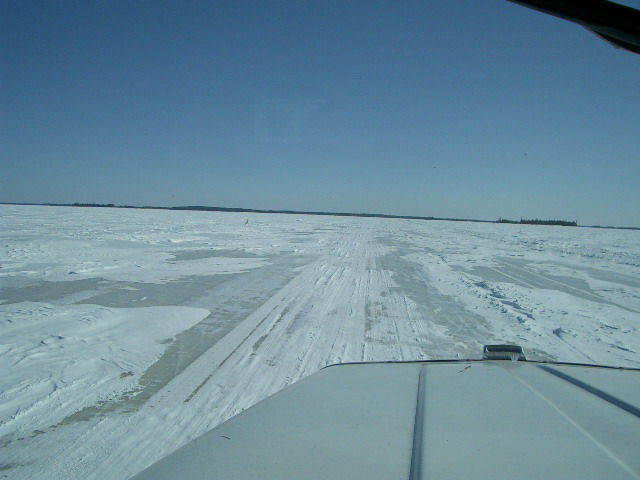 Rules for driving on the ice are very strict: Max 15 kilometres per hour (about 9 mph), 25 kph empty. Trucks must maintain at least one km spacing; passing is forbidden. Never stop on the ice. Empty trucks and loaded trucks must meet, but the roads on the ice are ploughed 300 feet wide and they swing as wide as possible and reduce speed.