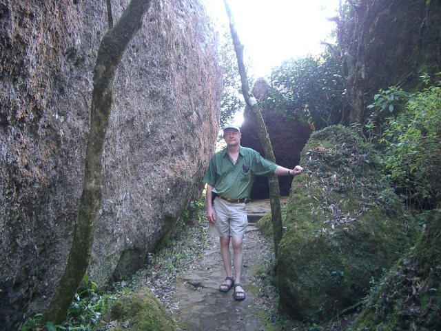 Crude steps and even cruder handrails help us make our way to the top of it. The view is spectacular! We are looking down on vultures soaring above the tops of tall pine trees. Our presence seems to be of some annoyance to local falcons, who streak past us at astonishing speeds, so close we can hear the wind whistling past their wings. They fly so beautifully we spend some time just watching them (and trying with little success to take their picture).