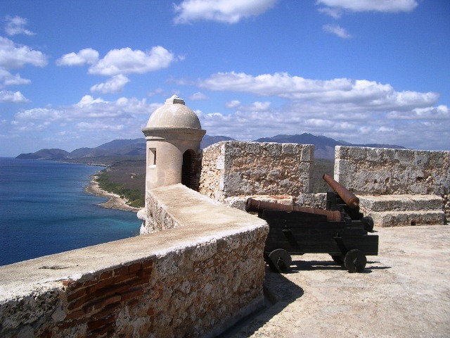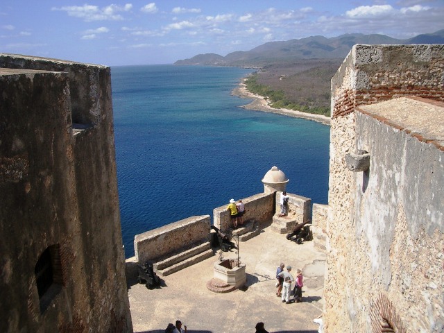 Today, our first destination is the fabulous Morro Castle -- the huge 17th century fortification which guards the narrow entrance to Santiago harbour. Santiago has the finest natural harbour in the entire Caribbean and was the reason for the city becoming the first colonial capital of Cuba in 1514. The capital was moved to Havana a few years later, but the the city and the harbour are still important to the economy of the eastern end of the island. The Morro Castle has been occupied by Spaniards and pirates alike and was demolished by Henry Morgan in 1662. In 1898, the Spanish fleet tried to break out of the harbour and was destroyed in a major naval battle. Several rusting wrecks still lie awash along the coast where they were sunk in the battle.