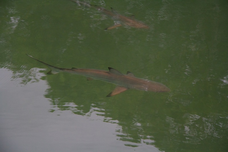 narrow channel between the two halves of the rock and see black-tipped sharks,