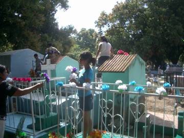 We travel at a sedate pace (so the visiting maestro de inglés doesn’t fall out) all the way to San Luis La Herradura, the location of the area cemetery. El cemetario is quite the sight! The street outside is lined with little shops and vendors selling every imaginable hue of artificial flower. Electric blue and neon scarlet predominate along with the silver that you find on Christmas trees. Side-by-side with the flower vendors are stalls selling hamburgers, grilled meats, tortillas, pupusas, cold drinks, fresh fruit and so on. The whole atmosphere reminds me of the fall fair. The graves are above-ground concrete vaults – some plain and simple and some very elaborate. On the Day of the Dead, families spend pretty much the entire day, tending to the burial places of relatives and loved ones who have passed away. Here, someone is putting a new coat of bright blue paint on a vault; there, girls are sweeping up fallen leaves and over here, two old trouts are driving in stakes and stringing three strands of barbed wire around a family plot. I don’t even think to ask. Like the fall fair, everybody is here. Misael, who seems to know every person within a twenty-mile radius of his home, takes me on a tour of introduction. I meet a bewildering array of Molina relatives, some passed away decades ago, some still walking above ground. I meet his abuelo (grandfather) who died in 1982. I meet his infant son who only lived a month. I meet his eldest brother who was killed in a fight in 1995. I meet uncles and cousins who are here for the day, tending the graves of their family members like everyone else. Actually, I notice it is pretty much the women and girls who do the tending while the men spend a lot of time shaking hands and clapping each other on the back.