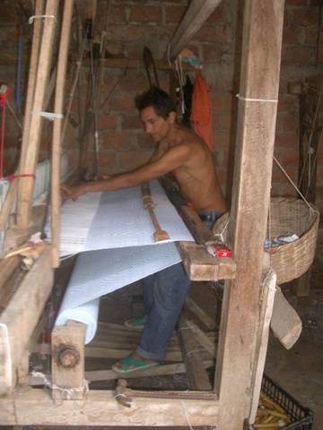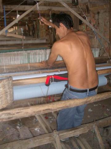 San Sebastian is a small town, famous for weaving and Susan is drawn to it like a moth to a flame. A weekly market fills the central square in front of the church with noise, colour, people and cheap goods of all descriptions. Our guidebook is fifteen years old and of little help, but a kindly gentleman gives us directions to the weaving workshops. Each of these has a small retail shop on the street with all of their products for sale. In a matter of minutes, Susan has completed her souvenir shopping. Then we ask if we can watch the weavers at work. The shop lady leads us back through the kitchen and living area into a large shady yard, filled with primitive looms. At each loom sits a weaver, who pulls on a cord to make the shuttle fly back and forth. His feet dance over a dozen foot pedals to raise and lower different warp threads each time the shuttle flies, creating the complicated patterns of the finished product. The looms look like they are constructed out of odd scraps of ancient wood (and probably are), but the cloth that comes from them is beautiful.