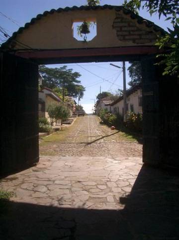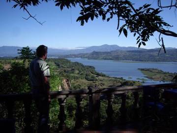 As part of my ongoing efforts to impress Susan and convince her that it really is a good idea for me to travel to exotic destinations while she slaves away in the tar sands, I have booked us into the nicest hotel in town. La Posada is an old colonial building, possibly a convent or maybe just the former residence of a wealthy person. We drive down a narrow cobblestone street, though a gate with a bell above it and into a quiet, shady courtyard. The main building containing office, restaurant and bar sits on the very edge of a steep cliff overlooking the Cerron Grande reservoir. In 1976, the Rio Lempa was dammed to produce hydroelectric power, creating an extensive lake . The view of the lake down in the valley with layers of mountains above is breathtaking. We sip a complimentary coctelito (in fact we sip two) on the balcony while taking in the view. Then we move to the dining room for a lovely meal. The staff is impeccably trained, the food is excellent and a bottle of Argentinean red wine tops it off. Our room is in an old building with two-foot thick walls and high ceilings. Narrow double doors of antique wood open onto a covered gallery. Beyond are shady gardens with paths and benches and fountains.