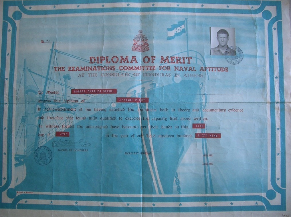 My license is an impressive document, 18” x 24”, with an image of a huge freighter on it and it says “The examinations committee for naval aptitude hereby grants… etc, etc.” It is signed by the Vice-consul of Honduras in Athens and the Admiral of the Honduras navy. (Well the Admiral’s signature is actually a rubber stamp.)