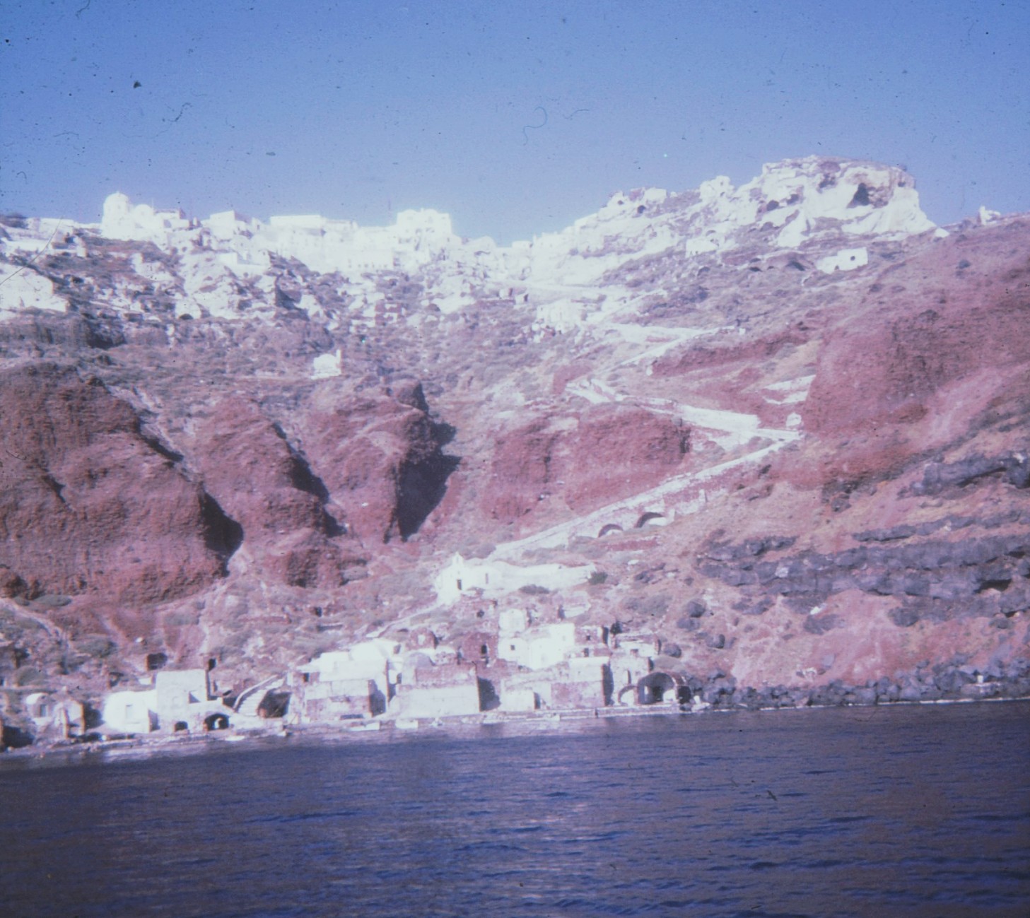 The only harbour in Santorini is at the base of sheer cliffs, which rise nearly 1,000 feet from sea level. There are a few houses and a taverna at the harbour, but the main town, Phira, is perched high above on the edge of the cliffs, overlooking the caldera. A cobblestone pathway with hundreds of steps, switchbacks up the face of the cliff to the town above. Dozens of donkeys stand ready to carry us up the steps.