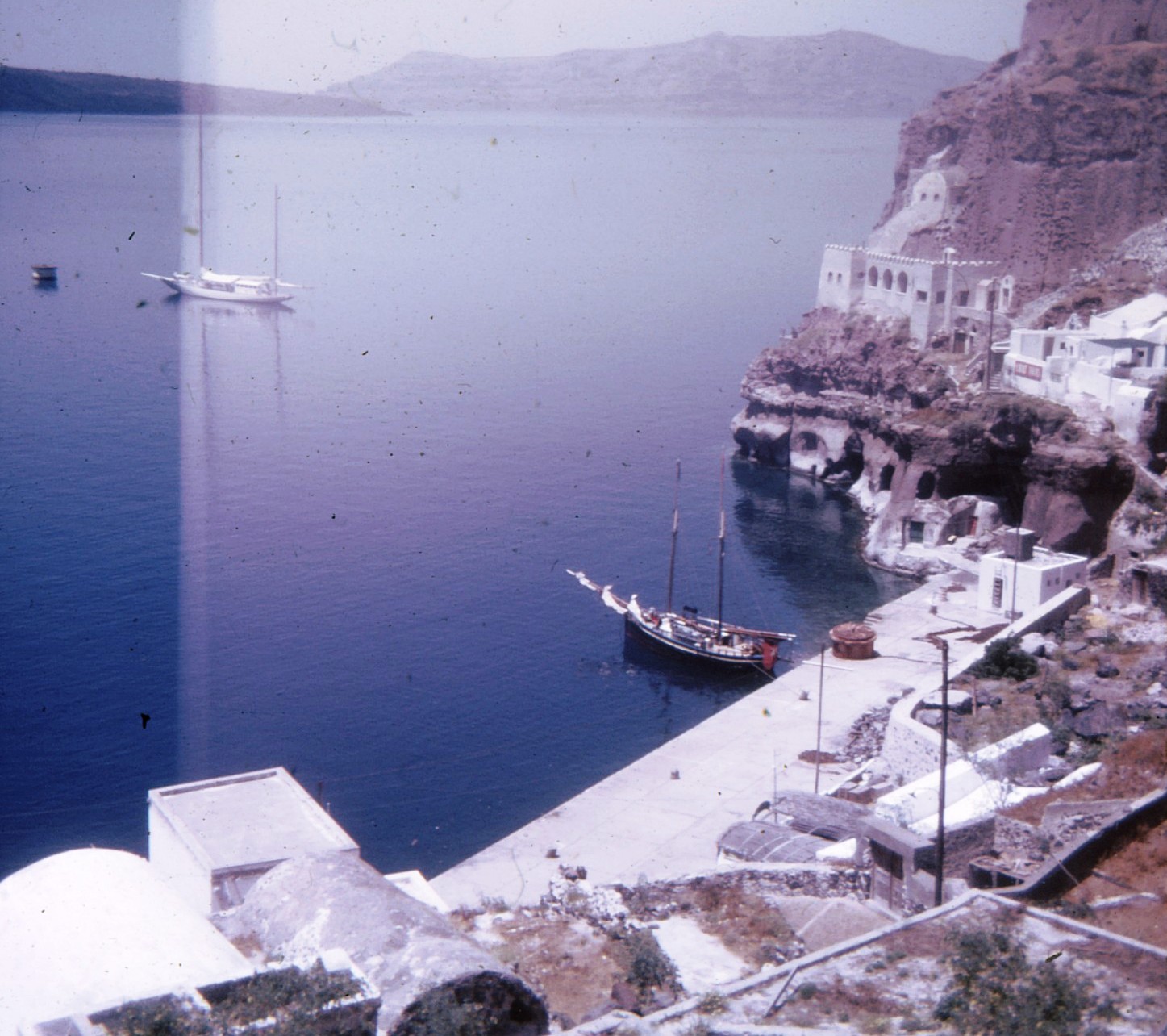 We rent little motor scooters and set out to tour the island. Our first stop is at Petaloudes or the Valley of the Butterflies. During the summer, thousands of Tiger Moths collect in this sheltered valley. We drive through forests of pine and olive trees and pass beautiful deserted beaches. We stop for lunch in a village and a little old lady gives us some apricots picked from her own tree. We meet a Greek fellow from Fort William, Ontario, who is revisiting his home village.