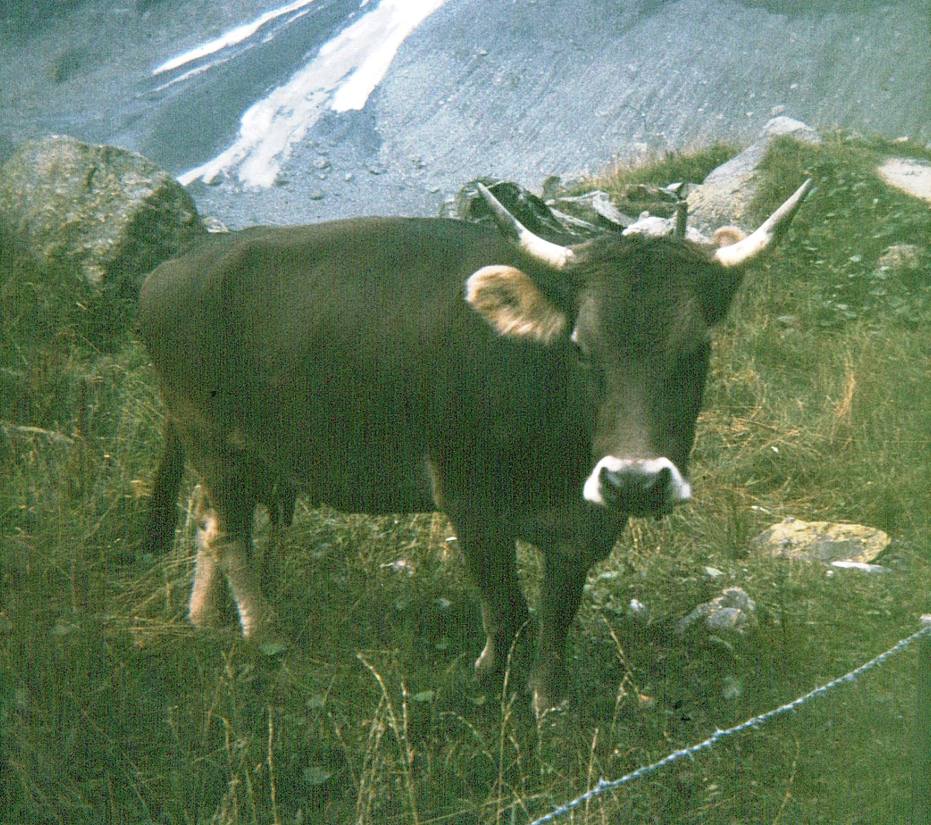 The “frail and elderly” Herr Roth takes off up the path like a mountain goat, trailed by a 21-year-old boy (who is in pretty good shape) puffing and panting and trying valiantly to keep up. At intervals, he stops and explains the geology and history of the area and points out interesting sights. I suspect he is just letting me rest and catch my breath. We hike back down past the Marmorbruche (marble quarry) and then into Wärgistal and Vor Dem Holz where the Families Jaggi live. Herr Roth points out the house where our Jaggis used to live and the school they attended. While hiking down the mountain, I make the acquaintance of several cows. Most are Simmental but I meet a couple of Brown Swiss as well.