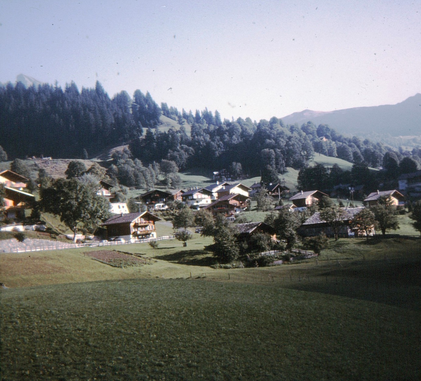 The population of the town isn’t very large but it spreads out all over the floor of the valley. Every house looks like a Swiss chalet on a postcard – which, of course, it is! Outside of the business section of the village, there are tiny farms all through the valley. Each one is a house and a stable about half an acre of farm. The fields all look like lawns with not a blade of grass out of place. All around the valley, the mountains rise up to 12,000 feet with snow on top.