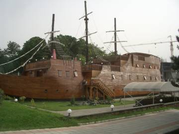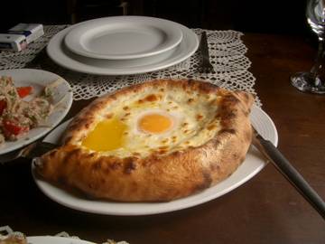 We go for lunch to rather bizarre looking place – built like a huge wooden sailing ship, parked on the beach. Inside, it is actually a very nice restaurant, seating about 200. By now I have come to take massive, delicious lunches for granted, but this time I am in for a special treat. Kachapuri is a staple at every Georgian meal. It is usually very much like a plain cheese pizza and it is eaten as an appetizer course while waiting for the main courses. Apparently, Ajarian kachapuri is famous all over the country and nothing will do but I have to try it. A large, flat bread is hollowed out and filled with cheese, like the typical kachapuri, but in Ajara, they add a lot of butter, milk and an egg and then bake it in the oven until it all cooks together. It is delicious, and would easily, by itself, provide a meal for several people – not just one middle-aged Canadian who is also expected to eat a small, tasty fish, some shashlik, tomato and cucumber salad and wash it all down with quite a bit of a famous semi-sweet red wine called kvanchkara. One of the reasons this wine is famous is that it has the dubious distinction of being the favourite of Josef Stalin. The other reason is that it is very tasty, indeed.