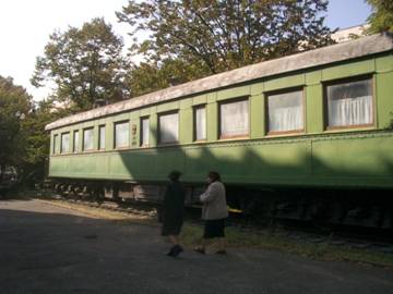Outside the museum building, is the tiny wooden house where Stalin was born and spent his childhood. The single room contains original furniture and artifacts used by his family. I get my picture taken sitting in a wooden chair at the kitchen table where the family ate their meals. Next to the museum building, is the private rail car, in which Stalin, who refused to fly in an airplane, traveled about the country. He used the railcar to visit the Front during the ‘Great Patriotic War of 1941 – 1945’ and the Potsdam Conference where the terms of the German surrender were hammered out.