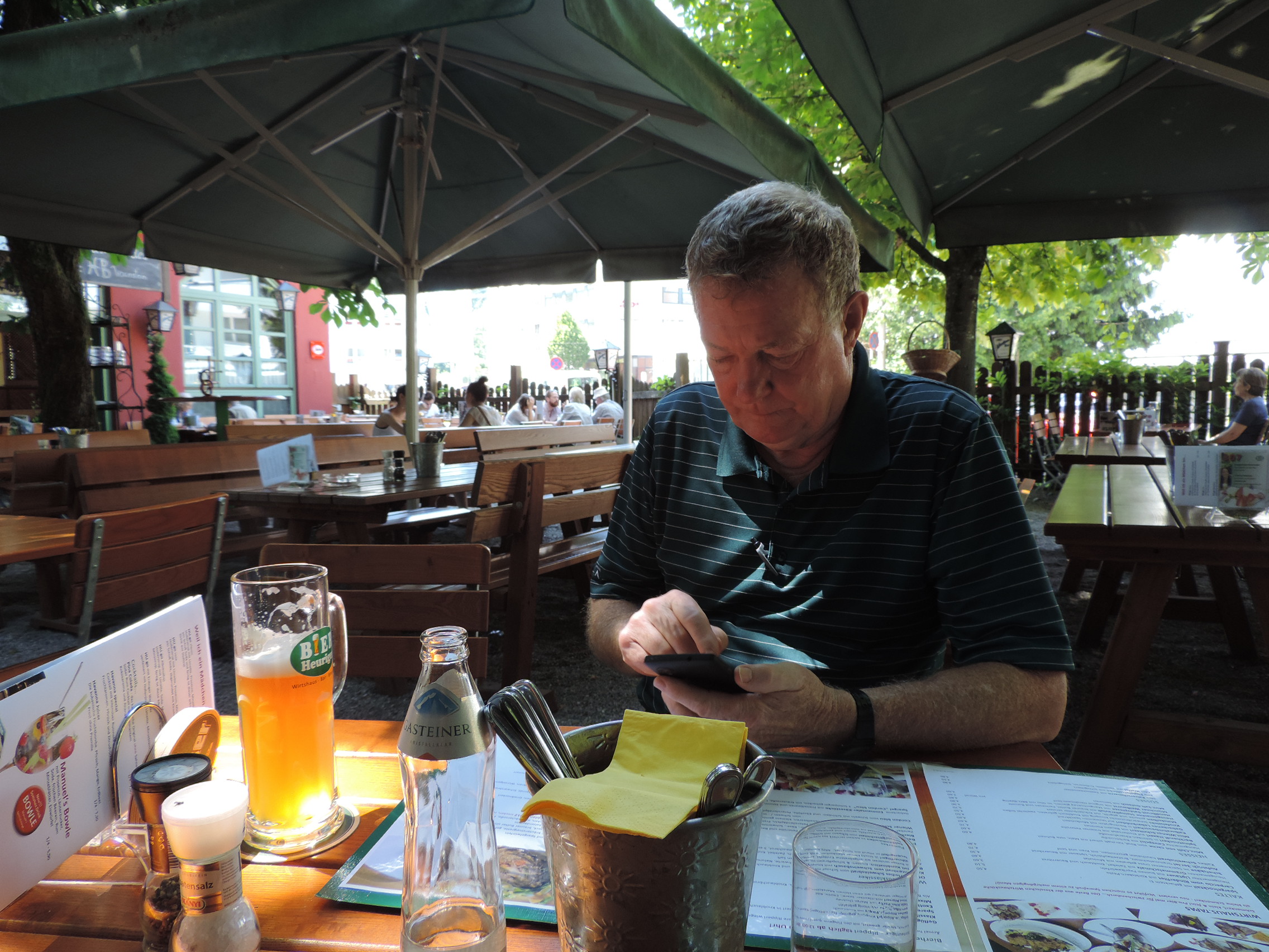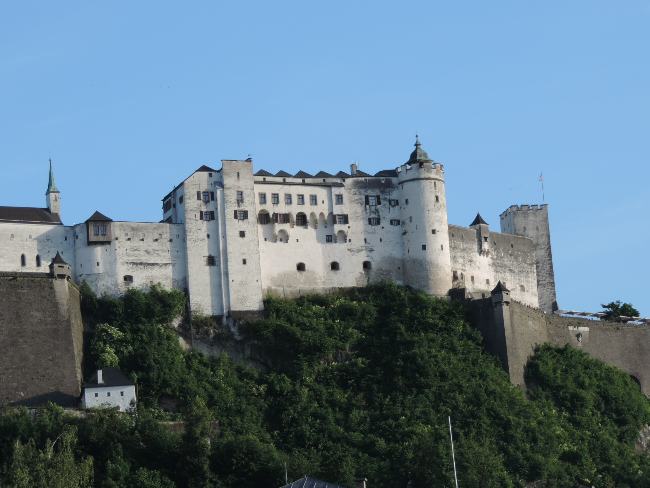 The number 6 bus passes in front of our BnB and takes us downtown. The squares in the old town are big and spacious with fountains and waterworks. The largest is Mozartplatz, Salzburg being the home of that great musician. A busker plays classical guitar in front of the church which is filling rapidly with young people for some kind of youth festival. The streets off the square are insanely packed with people. Food and beer are readily available but the tables are jammed and no seats are available. Six live bands play at strategic locations. We wander through the crowds, enjoying a frozen yogurt cone and taking in the sights. Eventually we find a quiet place to enjoy a glass of white Austrian Zwegielt before catching the number 6 back to our place.
