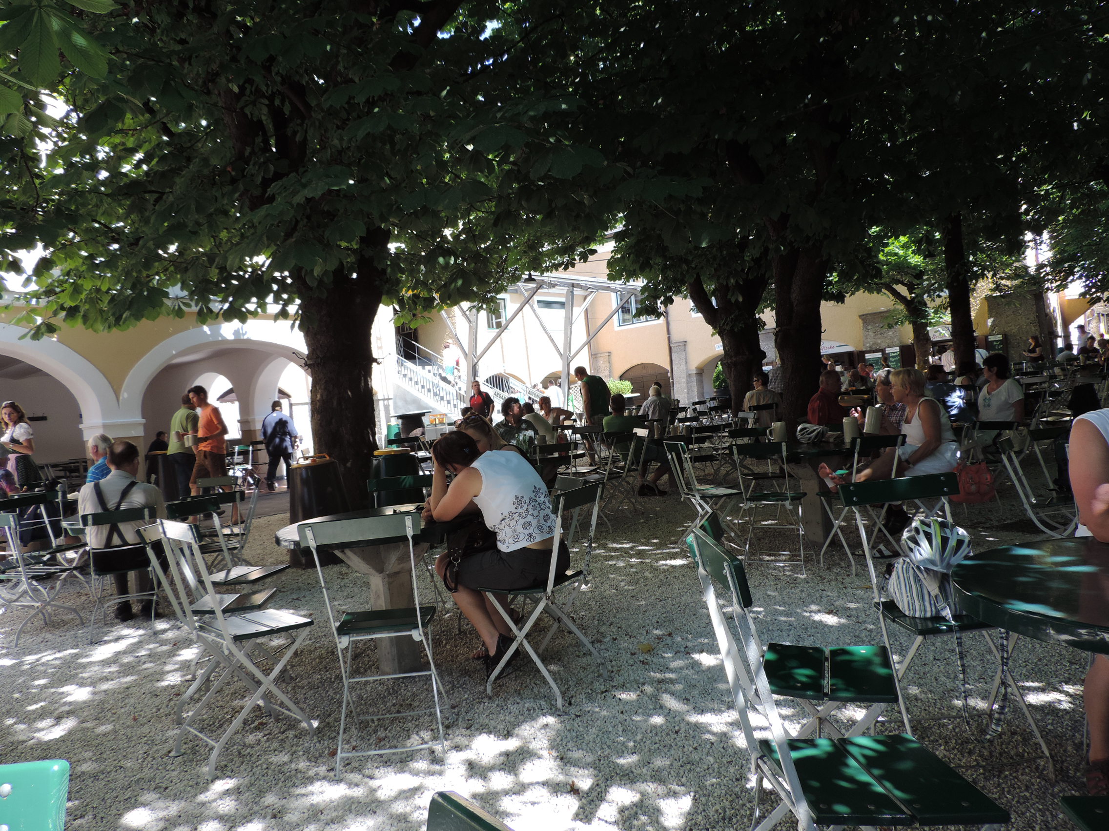 Our next stop is the famous Augustiner Braüstübl. It is a huge place with several large indoor beer halls, but on a hot day like today, everyone is outside in the beer garden. Hundreds of tables and chairs under big leafy shade trees. We buy tokens, pick up one-litre stone beer mugs and then stand in line to have them filled right out of huge wooden kegs. It is purported to be the best beer in the world. We certainly like it! Inside the building is the delicatessen arcade: a row of booths, each one selling an Austrian specialty. We each enjoy a plate of roasted pork belly and German potato salad. It is a wonderful, friendly place and a couple of native Salzburgers sit down with us at our table and chat while we eat. It is immensely pleasant, sitting under the trees, drinking fabulous beer. I suggest we could stay here all summer. We made a serious error in strategy -- we should never have driven to this place in our own car! On the other hand, if not for having to drive, we might still be here at midnight!