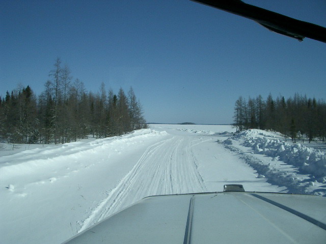 Rules for driving on the ice are very strict: Max 15 kilometres per hour (about 9 mph), 25 kph empty. Trucks must maintain at least one km spacing; passing is forbidden. Never stop on the ice. Empty trucks and loaded trucks must meet, but the roads on the ice are ploughed 300 feet wide and they swing as wide as possible and reduce speed.